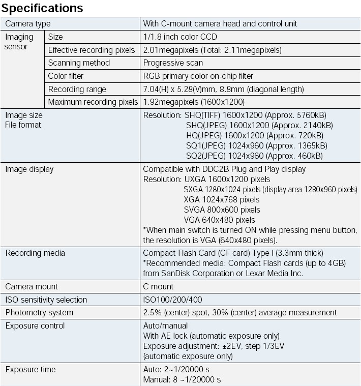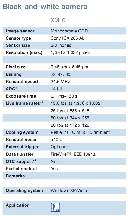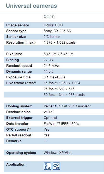 XC10은 1,376 x 1,032 픽셀의 CCD 칩을 내장하고 각 칼라 채널은 14 비트를 제공합니다. 2x 비닝 모드로 카메라는 초당 15 프레임보다 고속의 영상을 제공합니다.