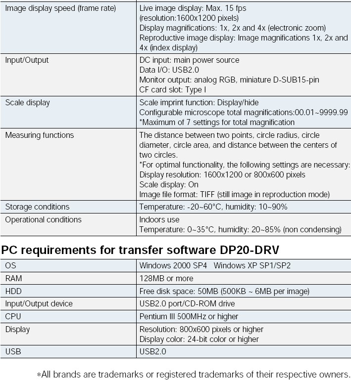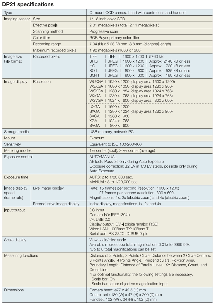 DP20 은 별도의 PCI 보드가 필요 없는 USB2.0 타입으로 편리하게 computer에 연결할 수 있습니다. 또한 별도의 프로그램과 computer가 없어도 바로 모니터에 연결하여 편리하게 사용할 수 있습니다. DP20은 200만 화소를 제공하며 live영상에서도 15frames/sec을 지원하고, DP12와 비슷한 가격으로 더 높은 수행능력을 지니고 있습니다. computer 와 함께 사용하기 위해서는 기본 SOFTWARE인 DP2-BSW를 사용해야 하며 이 software는 거리, 다각선, 사각형, 원 측정이 가능합니다. 또한 anaysis five와 함께 사용하면 보다 다양한 image analyzer의 기능을 수행할 수 있습니다.