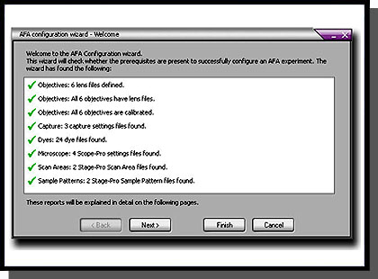 The Configuration Wizard guides you through the necessary setup procedures to ensure the success of your acquisition. AFA will automatically check to make sure it has the necessary settings to acquire your images, including objective lenses, spatial calibrations, camera settings, lookup table information, and Scope-Pro settings.