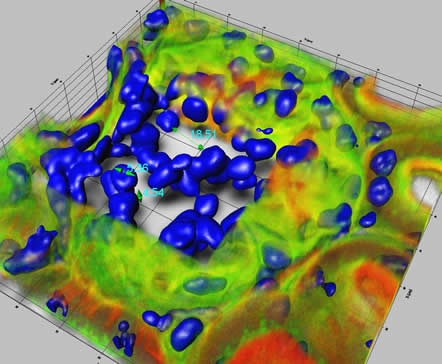 Use Image-Pro’s colocalization tool to indicate which fluorescent regions are to be considered as overlapped, or colocalized. Then activate 3D Constructor to display the colocalized regions in three dimensions.