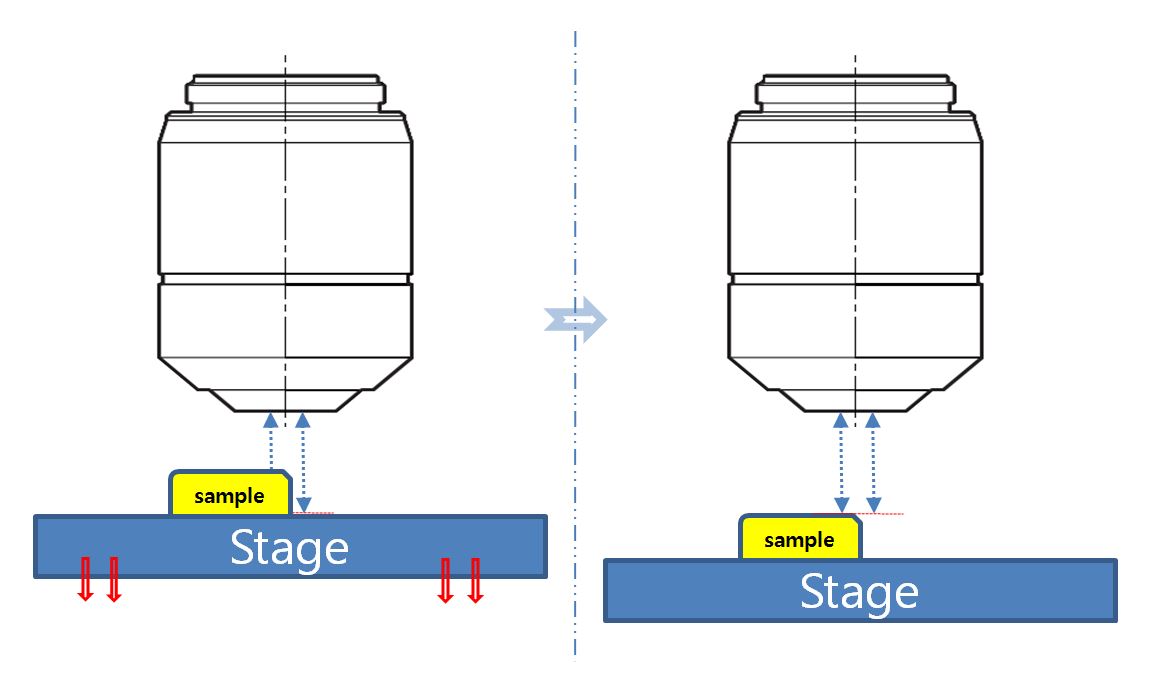 Left: Focus on top of sample (Z-axis reset), Right: Focus on bottom of sample (Z-axis height measurement)