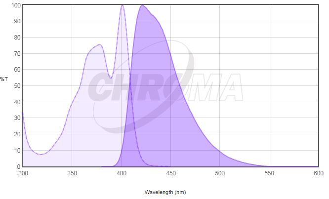 Chroma, Fluorescence, Fluorochrome AlexaFluor 405 2018년 5월 28일 J.H.JIN Spectrum Chart AlexaFluor 405 Spectrum Excitation (㎚) Emission (㎚) 401 422 Recommended Filter Set 일반 형광 Lighting source 사용시 -> 문의 주시기 바랍니다. 레이저 Lighting source 사용시 -> 문의 주시기 바랍니다.