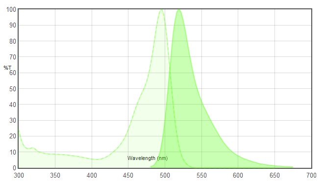 FITC has excitation and emission spectrum peak wavelengths of approximately 495 ㎚ /519 . Like most fluorochromes, it is prone to photobleaching. Because of the problem with photobleaching, derivatives of fluorescein such as Alexa 488 and DyLight 488 have been tailored for various chemical and biological applications where greater photostability, higher fluorescence intensity, or different attachment groups are needed.