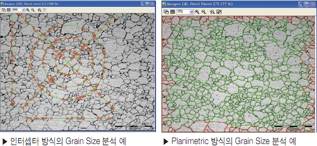 Planimetric 방식의 Grain 측정방식은 Grain 경계의 재건을 위한 고성능 알고리즘을 지원하여 신뢰성 있고 정확한 Grain Size 분석을 가능케 합니다.
