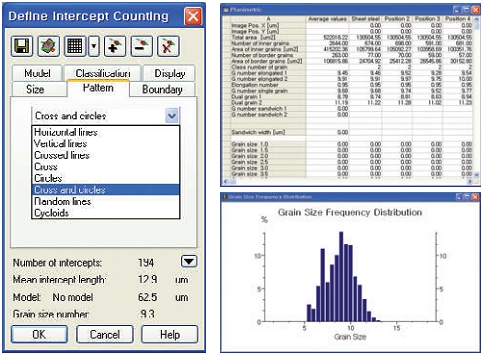 analySIS TS Material은 Grain Size 분석을 위하여 Intercept 및 Planimetric 방식의 분석기능을 제공하고 있습니다. Intercept 방식의 경우 수평, 수직, 대각, 원 조합 설정을 ISO, ASTM, JIS, DIN 등의 규격을 지원합니다.