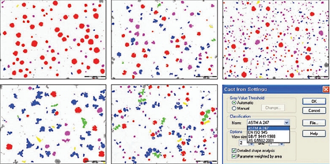 그라파이트 입자의 모양과 크기기를 분리하여 자동으로 검출 및 평가가 가능합니다. 또한 카본 펄라이트 비율분석도 지원합니다.