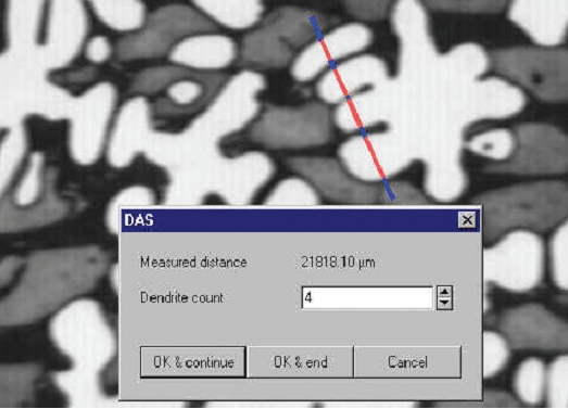 덴드라이트 암 간격은 캐스트 알루미늄 내의 평균 덴드라이트 암의 간격의 표준에 따른 결정을 위한 것입니다. 덴드라이트 암은 임계값의 평균에 의해서 자동적으로 검출 됩니다.