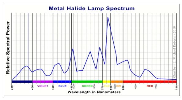- 유효수명이 최대 2000시간으로, 일반적인 수은 램프의 200시간이나 제논 램프의 400시간과 비교하면 훨씬 길다.Spectrum of Metalhalide
