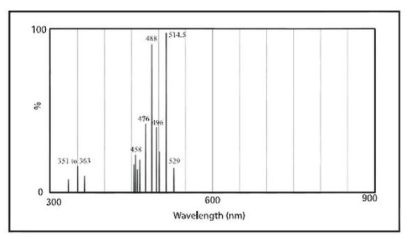 - 보통은 단색광의 좁은 스펙트럼 대역에서 극히 밝다. 하지만 레이저광의 간섭성으로 인해 샘플 영역에 균일한 조도로 비추기 어렵지만, Confocal 현미경에서는 갈바노 미러를 이용한 스캔 방식을 이용하여 이미지 획득시에 사용되어진다(LSCM).