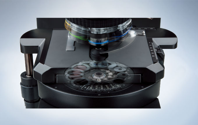 투과 조명 방식의 변경은 알맞은 맞는 대물렌즈 선택에 앞서 정확한 ND 필터, 편광판(Polarizer) / 분석판(Analyzer) 그리고 집광기 설정이 수반되어야 함을 의미합니다. 8구 범용 집광기는 모든 배율에서 사용할 수 있도록 상단 렌즈(Top lens) 까지도 조절합니다.. 이 집광기는 미분간섭(DIC) 프리즘, 위상차(Phase Contrast) 링슬릿과 편광판(Polarizer) 같은 광학 요소들의 쉬운 선택을 보증합니다. 조명과 대물렌즈를 잘 호환하기 위해, 광량 조리개는 자동으로 사용하고 있는 대물렌즈의 개구수로 설정됩니다.