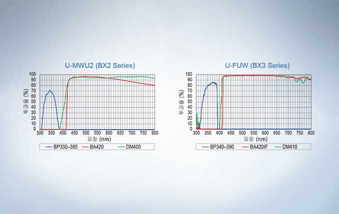 광학계의 품질은 광학 현미경의 핵심입니다. Olympus UIS2 광학계는 개발되어 정확도와 선명도의 기준을 선도합니다. 높은 NA값을 갖는 대물렌즈는 색수차를 보정하고 고해상도 영상 획득이 가능하여 약한 신호도 감지할 수 있습니다. Olympus는 선별된 유리 원료에 고급 UW 다중 코팅 기술을 적용하여, 대물렌즈의 자가형광(Fluorescence)을 감소하고 S/N ratio를 눈에 띄게 개선하였습니다. UW multi coating은 넓은 파장대에서의 고 투과율로 평탄한 영상을 보여 주며, 연구 용도의 여러 형광(Fluorescence) 색소의 최대 성능을 보장합니다.