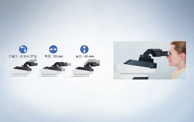 현미경 사용 시, 바르면서 편안한 자세를 취하는 것은 필수적이나, 전적으로 사용자에게 달려있는 부분입니다. 인체 공학적으로 완벽한 거리, 꺾임, 높이 조절이 가능한 경통은 경사각, 길이와 높이 조절이 가능, 3차원적으로 완벽하게 유연한 설정이 가능합니다. 결과적으로 현미경을 정확히 사용자에 맞게 조정할 수 있습니다.