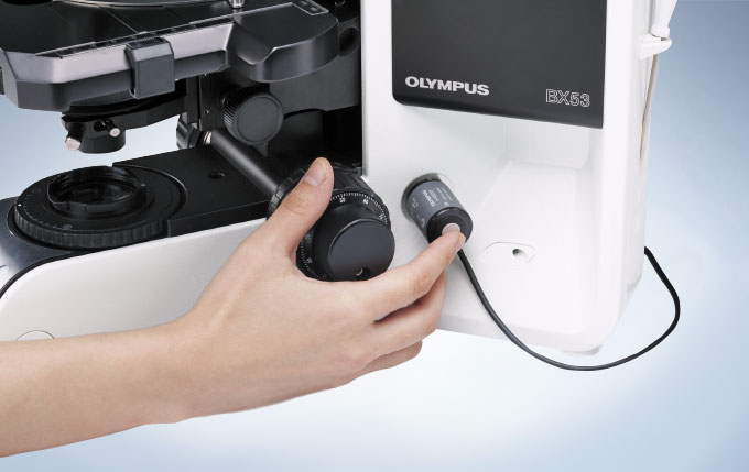 BX53은 중앙에 위치한 광량 조절 장치와 형광 조명 셔터를 어떤 손으로든 다룰 수 있게 하여 배치 시, 최대의 유연성을 발휘하도록 설계되었습니다. 또한, 미동나사는 핸들은 현미경 어느 측면에도 부착 가능합니다.