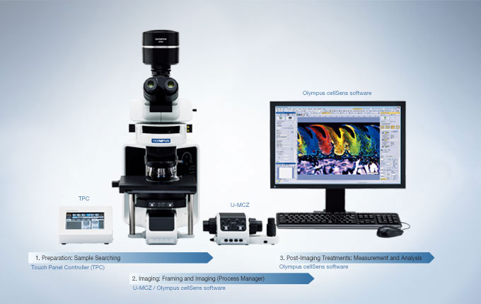 현미경을 조작하면서 라이브 영상을 보기 위해 애쓸 필요가 없습니다. BX63과 Olympus cellSens 소프트웨어*와 함께 실험대 그 어디에라도 놓을 수 있는 터치패널과 U-MCZ 유선 현미경 조정기가 제공하는 유연성은 모니터 가까이에 놓여진 U-MCZ를 이용하여 빠르고 효율적으로 초점조절과 영상 획득을 가능하게 합니다. 간단하고 빠른 관측 방법 및 배율 변경은 cellSens의 Process Manger에 의해 제공됩니다. 설정에 따른 다중 색상 및 다중 지역 그리고 기타 다른 영상 획득 방법들은 터치 패널이나 cellSens에 직접 될 수 있습니다. 획득 후의 영상 처리, 측정 그리고 분석은 Olympus의 cellSens 소프트웨어를 통해 완료됩니다.