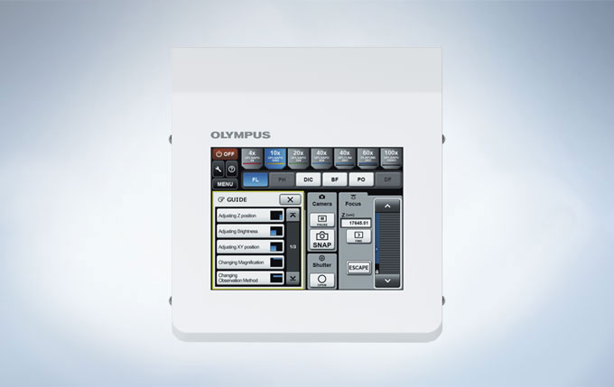 BX63은 한 번의 터치로 관찰법과 배율을 변경할 수 있습니다. 이 조종장치는 현재의 사용 과정을 알려주는 안내 모드와 현미경의 현재 상태를 즉시확인 할 수 있도록 모든 설정에 접근할 수 있는 고급 사용자 모드 중 하나를 선택할 수 있게 하였습니다. 또한, 여러 관측 지점과 조건의 저장이 가능하므로 다른 연구자들도 저장된 설정 불러오기를 통하여 신속하게 동일한 영상 획득 조건을 만들 수 있습니다.