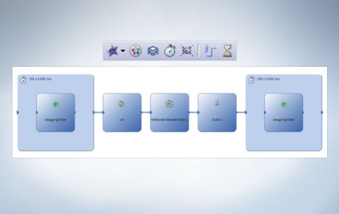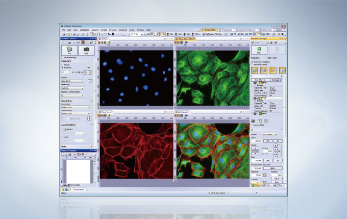 쉬운 multi-color, time lapse Z-stack 영상의 획득 단지, 적절한 획득 버튼을 선택하고 관련 매개 변수를 추가한 다음 “시작”을 클릭하면 됩니다. Process Manager나 Graphical Experiment Manager(GEM)은 multidilmensional 영상을 쉽게 쉽게 만들어 줍니다. GEM 기능은 실험들을 훨씬 다양하게 디자인할 수 있게 합니다. 게다가, 영상 획득은 6D까지 가능합니다 (XYZTλ multipoint).