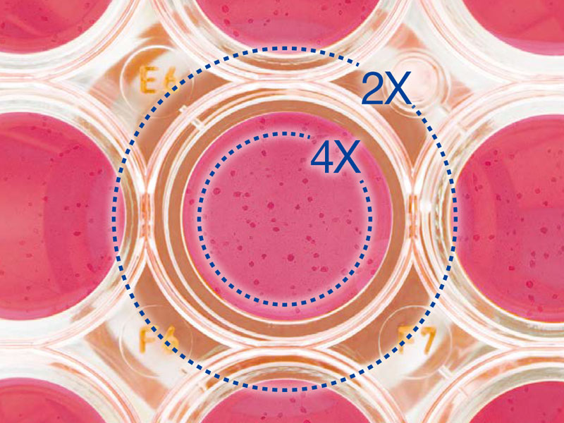 2X 대물렌즈는 다른 대물렌즈 보다 확연히 높은 contrast를 제공하여, 투명한 샘플도 명확하게 식별할 수 있습니다. 예를 들어, 96-웰 마이크로 플레이트 관찰시, 넓은 시야로 인하여 스테이지를 움직이지 않고 웰의 모든 세포를 관찰 할 수 있습니다.