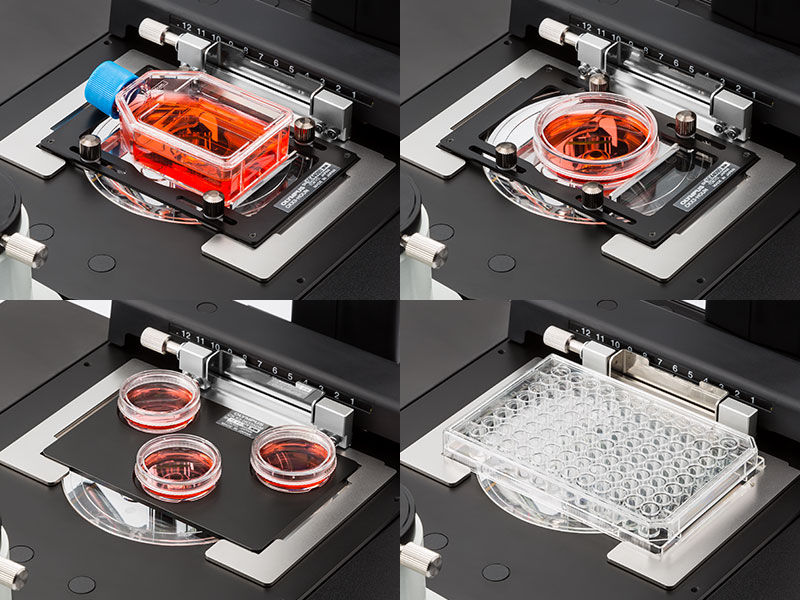 CKX53의 공용 홀더로, 디쉬, 마이크로플레이트, 플라스크를 포함한 다양한 용기에서 배양된 세포를 확인하기 쉽습니다. 옵션 홀더가 부착되면, 최대 세 개의 35㎜ 배양 용기를 스테이지에 장착할 수 있습니다. 또한, 다양한 마이크로플레이트를 별도의 홀더 없이 다룰 수 있습니다.