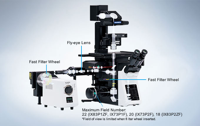 Olympus UIS2 무한보정 광학계는 폭 넓은 대물렌즈 군에서의 높은 광투과성을 보장합니다.UIS2 광학계는 넓은 파장대역의 색수차 보정과 어떠한 관찰 방법에서도 높은 해상도와 신호대잡음비를 제공하는 것이 특징입니다.넓은 시야 범위 및 Fly-Eye 렌즈 시스템은 밝기가 고른 형광 조명을 제공함으로써 센서의 크기가 큰 sCMOS 카메라 사용도 가능합니다.