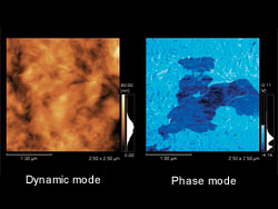 다이나믹 모드에서 스캐닝하는 동안 캔틸레버 진동의 위상 지연을 감지합니다. 샘플 표면의 물리적 특성의 차이를 이미지화 할 수 있습니다.
