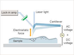 전도성 캔틸레버를 이용하여 교류 전압을 인가하여 캔틸레버와 샘플 표면 사이에 작용하는 정전기의 힘을 감지하고 샘플 표면의 전위를 이미지화 시킵니다. KFM (Kelvin Force Microscope)라고도합니다.