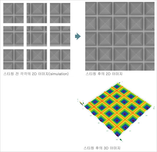 고배율의 이미지에서는 시야범위가 좁아지지만, 스티칭기능으로 최대625장까지 이미지를 붙여 높은 분해능과 넓은 시야범위로 이미지 데이터를 얻을 수 있습니다. 또한 넓은 시야 이미지로 3D 디스플레이 및 3D 측정이 가능합니다.
