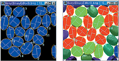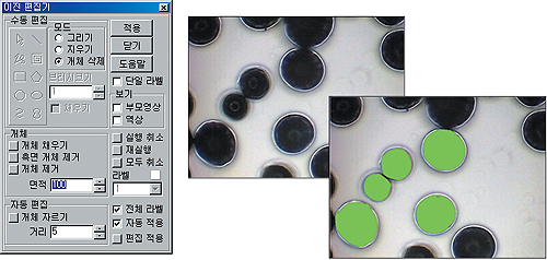 -채널별 밝기값, 또는 마우스를 이용한 채널별 색상 범위 선택에 의한 이진화 지원 -선택 영역의 다중선택, 다중 영역의 논리합, 차 선택